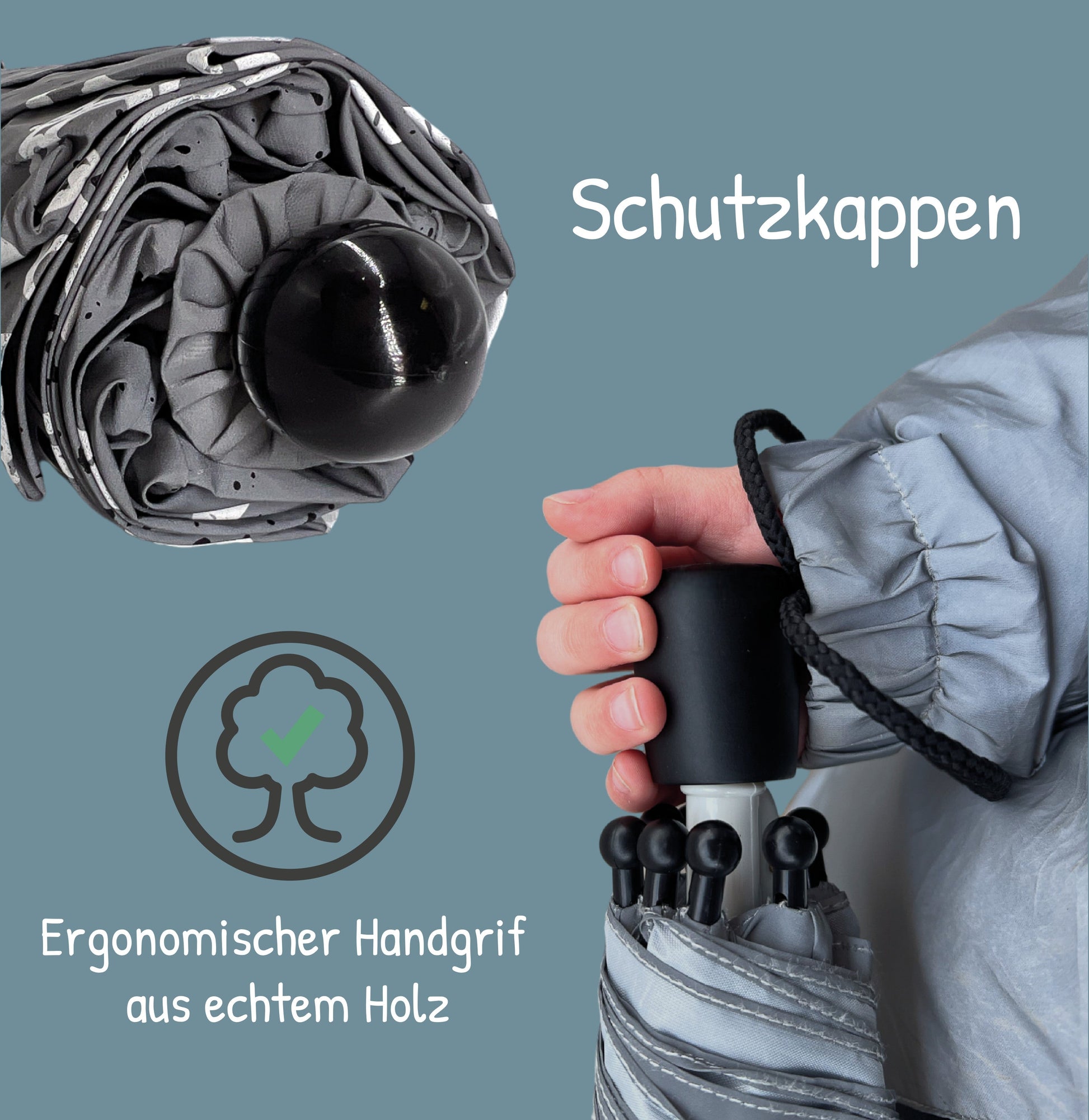 Das stabile Metallgestell in Kombination mit dem wasserabweisenden Polyester schützt zuverlässig vor Regen, Wind und Sonne. Der ergonomisch geformte Holzgriff liegt angenehm in kleinen Kinderhänden.
