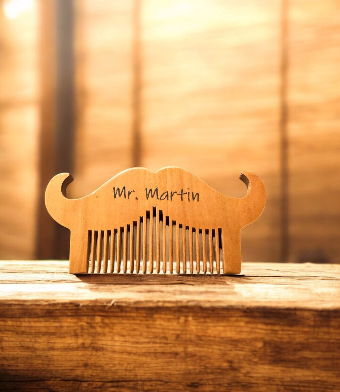 Dieser handliche Bartkamm aus Holz (10 cm) sorgt überall für einen gepflegten Bart – perfekt für unterwegs oder zuhause. Auf Wunsch wird er mit deinem Wunschnamen graviert. Egal ob Spaßgeschenk oder für den absoluten Bartliebhaber: Dieser personalisierte Holzkamm ist immer eine gute Idee.